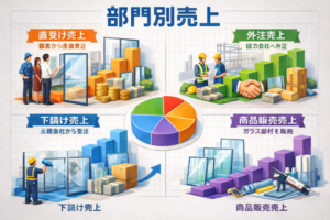会計ソフトに入力する際に、皆様も是非御社の部門毎の売上を分けて入力する事をお勧め致します。どの業種においても、売上と一言で言っても、様々な売上があると思います。例を挙げると、ガラス屋さんでは…
